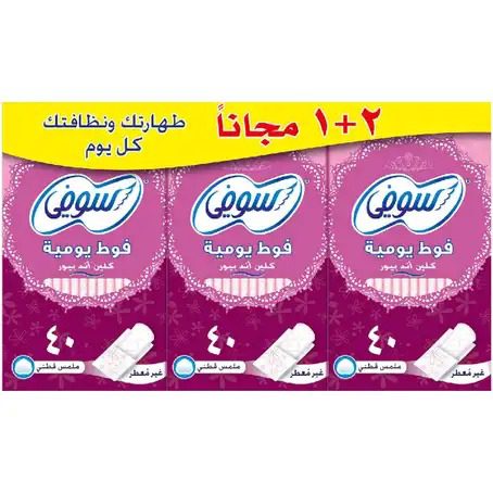 - سوفي كلين انر بيور اليومية بنعومة القطن, مرنة, مغلفة تغليف ثلاثي لتمنحك نظافة تامة لنشاطك اليومي,