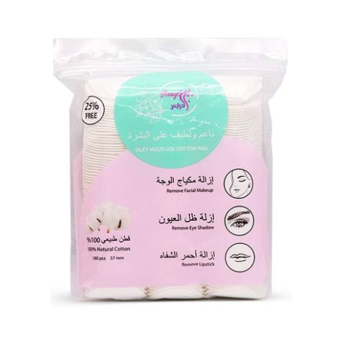 استمتعي بنظافة مثالية ولمسة حريرية مع “أقراص قطن العرائس” (Arays) متعددة الاستخدامات. صُنعت هذه الأقراص من “قطن طبيعي 100%” (100% Natural Cotton)، مما يجعلها آمنة وصحية للبشرة. تتميز بملمس “ناعم ولطيف على البشرة” (Soft and gentle on skin)، وهي مصممة خصيصاً لتلبية كافة احتياجاتك الجمالية: “إزالة مكياج الوجه، إزالة ظل العيون، وإزالة أحمر الشفاه” (Remove Facial Makeup, Eye Shadow, Lipstick) بكفاءة عالية. تأتي في عبوة توفيرية ضخمة تحتوي على “180 قطعة” (180 pcs) مع عرض خاص “25% زيادة مجانية” (25% FREE).
