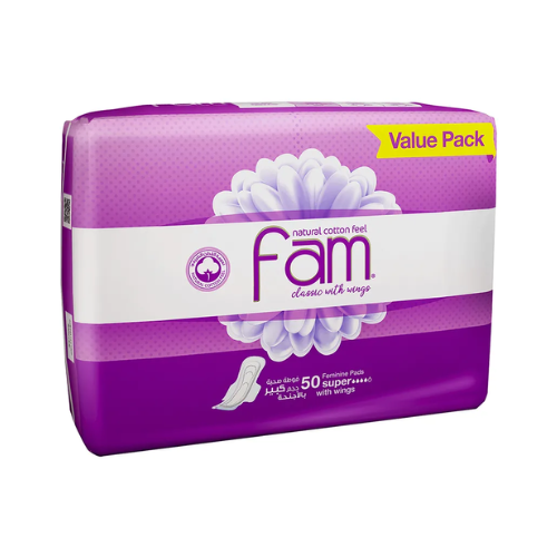 الوسوم: 50 فوطة, Classic, Fam, Natural Cotton feel, Super with wings, Value Pack, حجم سوبر, عبوة التوفير, فام, فوط صحية, كلاسيك, ملمس قطن