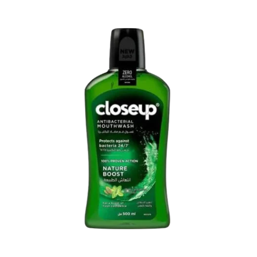 للعائلة التي تبحث عن انتعاش طبيعي وحماية قوية تدوم، نقدم لكم غسول فم Close Up Nature Boost بحجم 500 مل. يتميز هذا الغسول بتركيبة خالية من الكحول (Zero Alcohol) وبفعل مُثبت علمياً، يوفر دفاعاً متواصلاً ضد البكتيريا المسببة لرائحة الفم الكريهة على مدار الساعة (24/7). يمزج بين الحماية القوية ومستخلصات “انتعاش الطبيعة”، ليضمن لكم نفساً نقياً وإحساساً بالنظافة الشاملة للجميع.