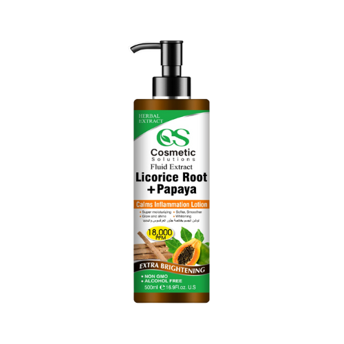 احصلي على إشراقة طبيعية ونعومة فائقة مع لوشن العرقسوس والبابايا من Cosmetic Solutions، تركيبة عشبية قوية بتركيز 18,000 PPM تساعد على تفتيح البشرة وتوحيد لونها، مع تهدئة الالتهابات والاحمرار، لتمنحك بشرة أكثر صحة وصفاء