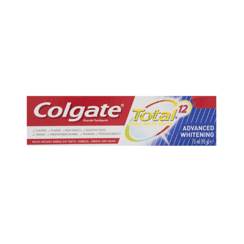 ارتقِ بمستوى العناية بفمك مع معجون Colgate Total 12 Advanced Whitening. هذا المعجون ليس مجرد مبيض للأسنان، بل هو درع حماية متكامل يوفر 12 ساعة من الحماية ضد الجراثيم في كل مكان بالفم: الأسنان، اللسان، الخدين، واللثة. تركيبته المبتكرة تساعد على إزالة البقع بفعالية وتوفر تبييضًا متقدمًا، مع تقوية المينا ومكافحة التسوس والجير.